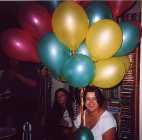 Jo - the party organiser and general hoodwinker. Thanks and praises to the good Jah Jo for a superb party, well received. Here she sits with the 30 Red, Gold and Green balloons she got for the party. The helium inside didn't take long to come out and into some peoples' lungs, though not Jo's from what I remember through the hazy recollection of the party!