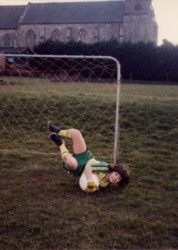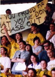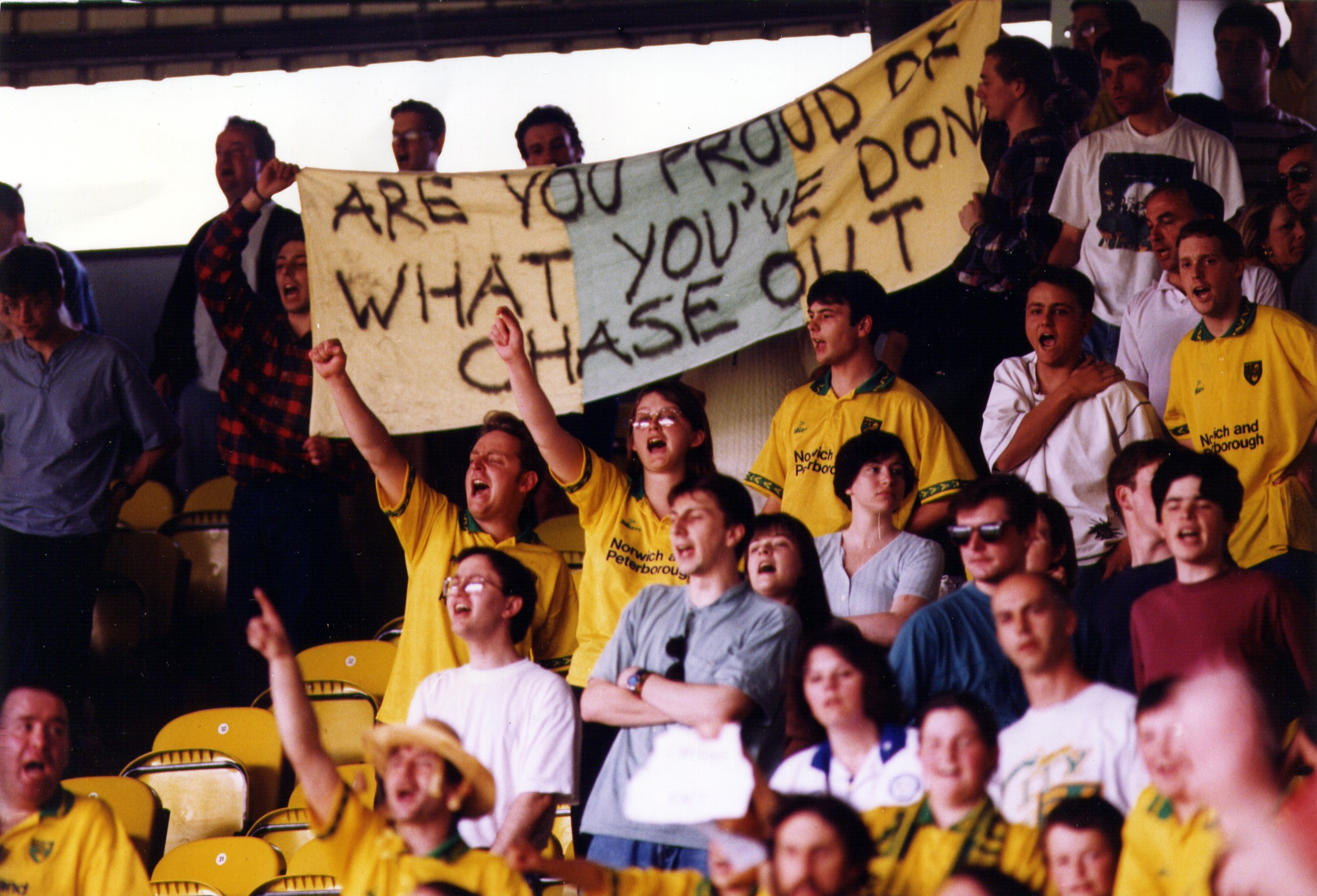 Liz is an enthusiastic Norwich City supporter, above she is pictured taking part in a demo against Robert Chase (then Norwich Chairman and owner). This photo was taken in April 1995.