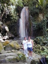Jo and myself at the Botanica Gardens Waterfall in St. Lucia. The colours on the rock come from mineral deposits such as copper and iron, or so I'm told. We had a superb time in the sunny caribbean and saw most of the island in a day, in a 4x4!